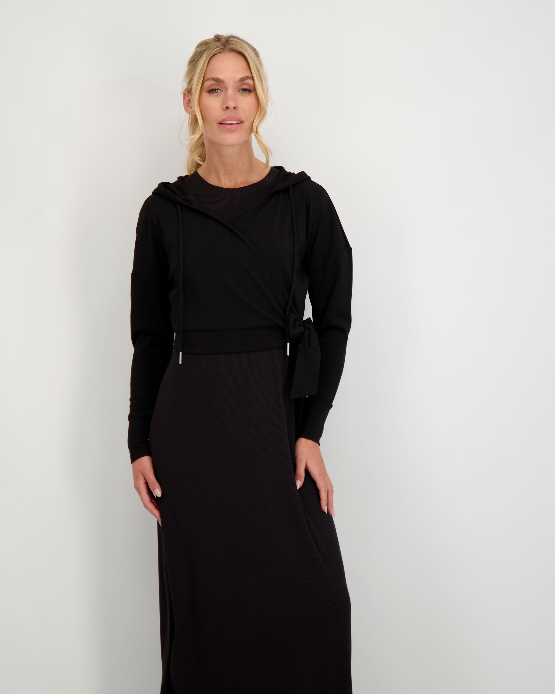 The Tokyo Top is a chic wrap tee made from our soft, breathable bamboo jersey fabric. Featuring a hood and one-sided wrap detail, it’s designed to flatter and move with you. Perfect on its own or layered over the Paris Dresses, it’s also bump-friendly—sitting beautifully over your baby bump.