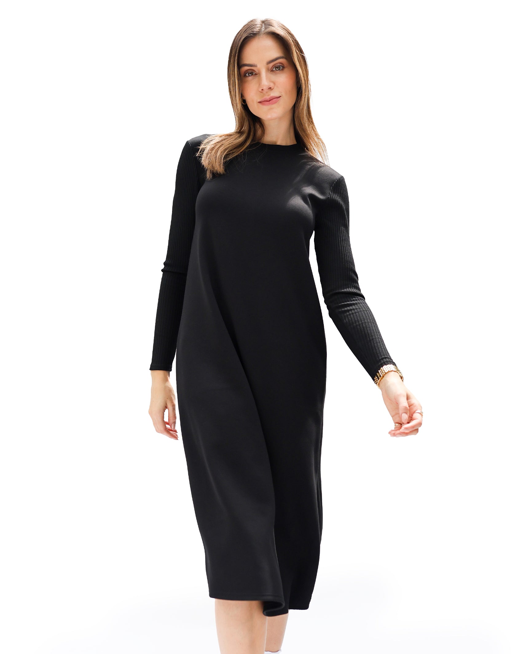 Effortlessly polished with a focus on comfort, the Scuba Wide Rib Swing Dress is designed for easy, flattering wear. Made from our buttery scuba fabric, this dress features a relaxed swing fit that drapes beautifully and allows for natural movement. The long sleeves are made from our wide ribbed fabric, adding a comfortable contrast and a lived-in feel. It’s a versatile piece you can style up or down with ease.