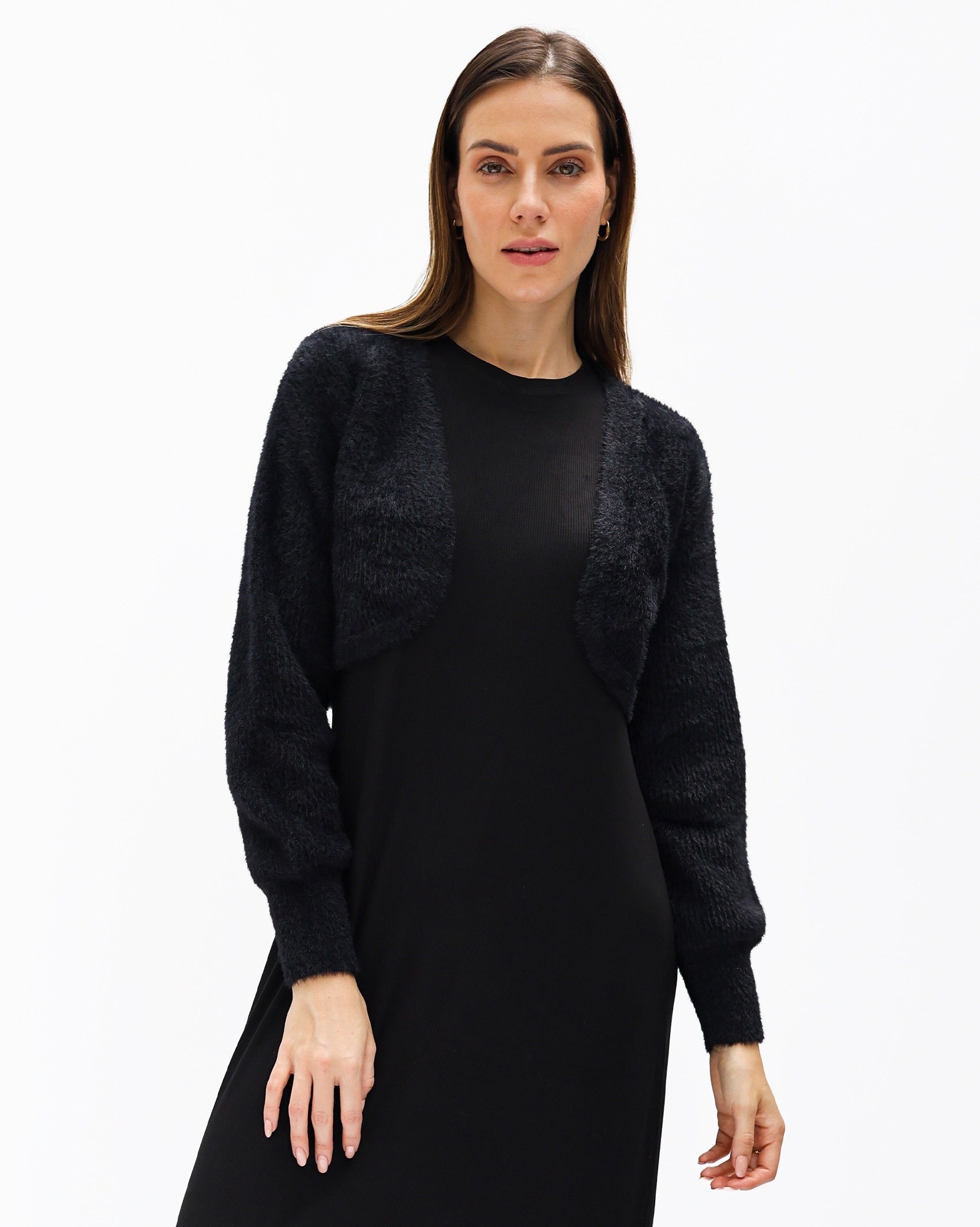 A cropped, ultra-soft bolero with cuffed long sleeves and a rounded front cut. It’s the perfect layering piece to add warmth and texture without covering your whole look.